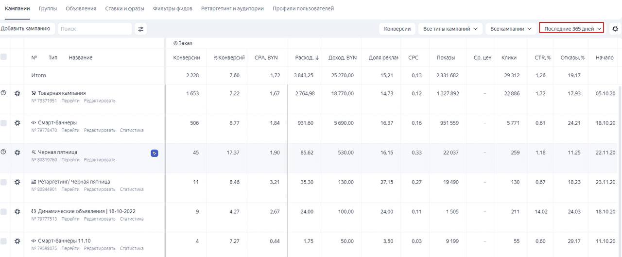 - Yandex — 82 конверсии, 20 ассоциированных конверсий. Стоимость заказа — 1,83 BYN,