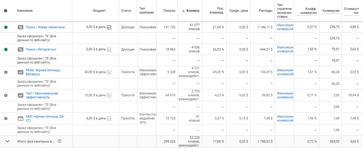 - Google — 82 конверсии, 370 ассоциированных конверсии, затраты, средняя стоимость конверсии 2,7 уе (по курсу на тот период примерно 8 BYN).
