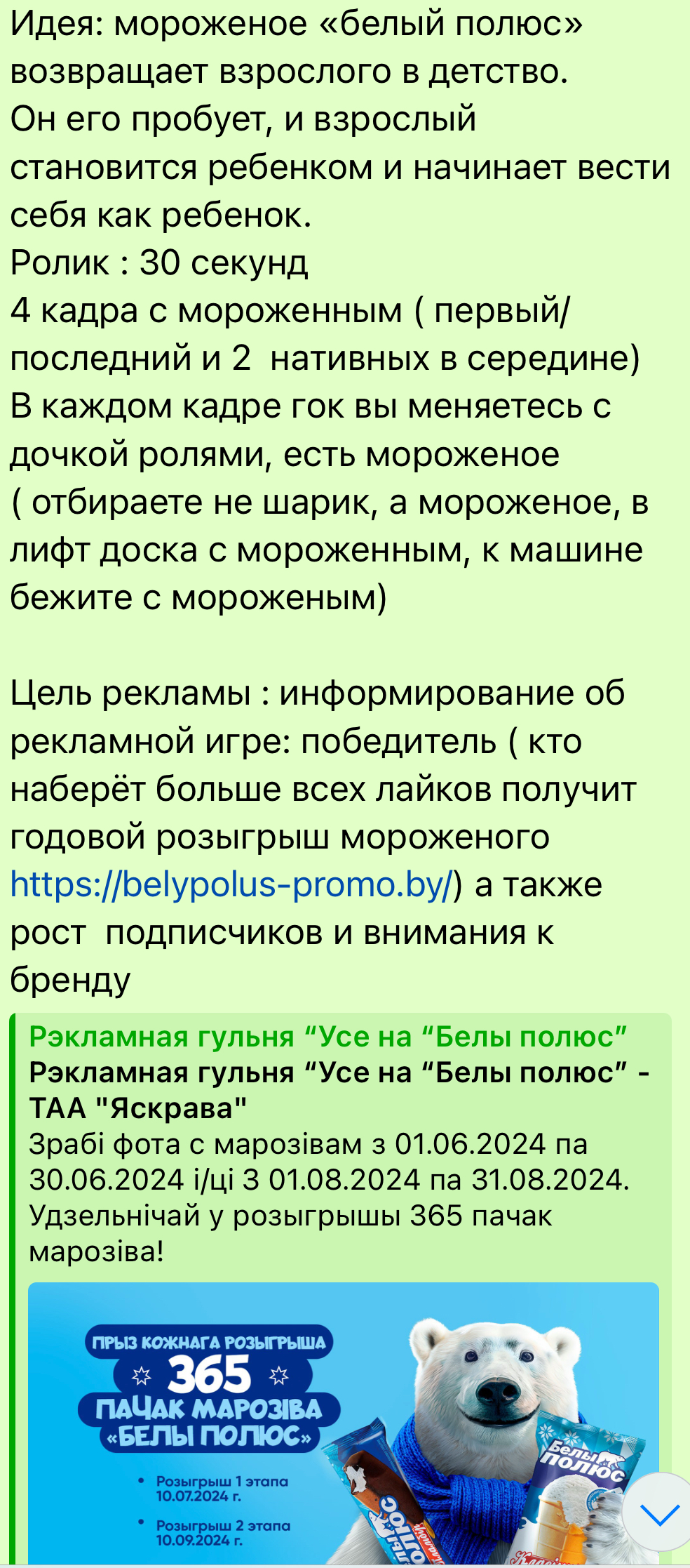 Помимо уникальной упаковки, нами была разработана стратегия, учитывающая ценности продвигаемого бренда. Для мороженого «Белый полюс» мы акцентировали внимание на семейных ценностях, мягкости и уюте детства – вкус, который каждый помнит с самого детства. Наша задача заключалась в том, чтобы передать ощущение домашнего тепла и натуральности продукта, отличающегося от современных массовых аналогов.