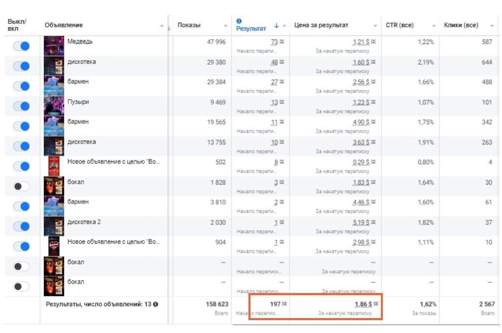 Получили много конверсий в виде начатых переписок со средней ценой 1,84 у. е. Всего в рамках рекламного бюджета их получилось около 200.