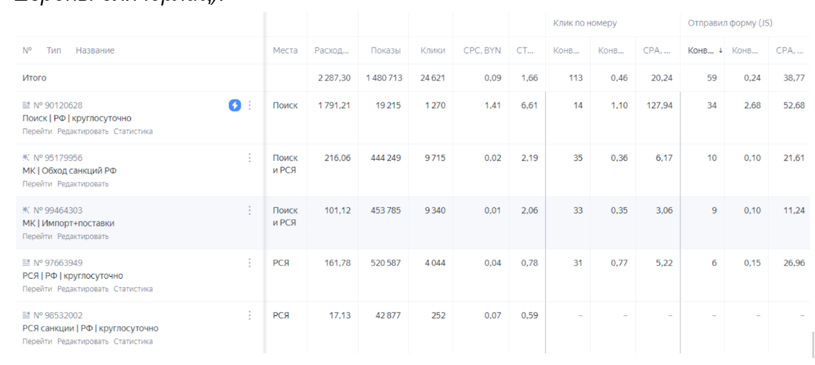 Итоги рекламы по Yandex: Более 200 заявок, средняя стоимость одной 35 BYN для узкой B2B ниши.