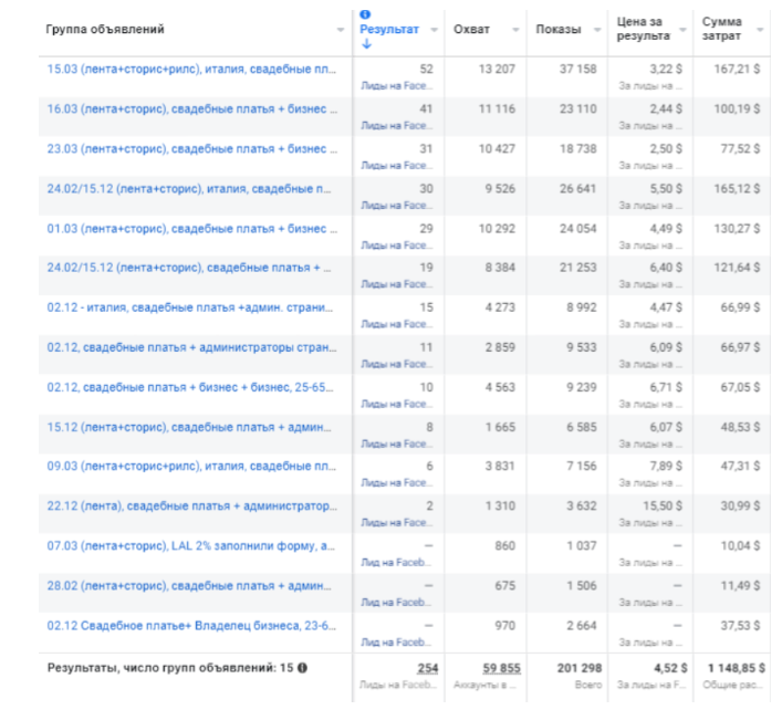 Задачей этой рекламной кампании был поиск продавцов для продажи свадебной одежды и свадебных платьев в различных регионах Италии. Рекламу делали через Facebook. Вначале запускали еще и в Instagram, но быстро поняли, что конверсии в Facebook в разы выше. При подборе аудитории большое внимание уделили геолокации, потому что одним из условий был один торговый представитель в одном городе.