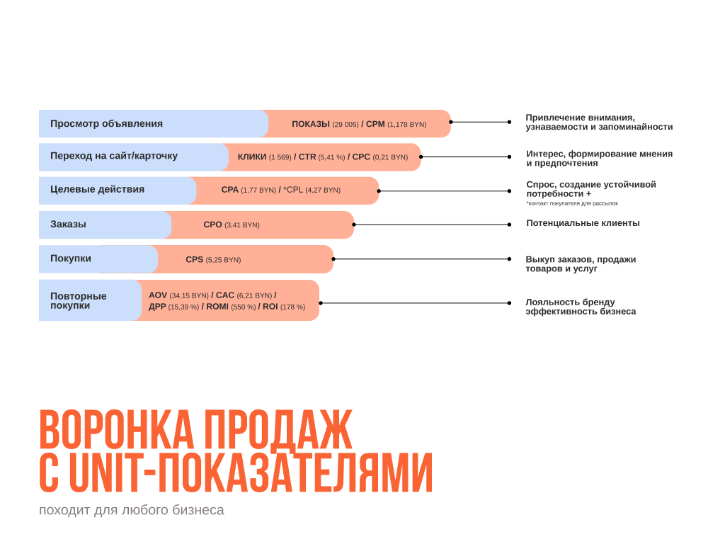 Данная схема подходит как для малого и среднего бизнеса, так и для крупных компаний. Разница лишь в том, что малому бизнесу необходимо собирать данные и рассчитывать показатели вручную, тогда как крупные компании могут использовать автоматические расчеты сквозной аналитики.