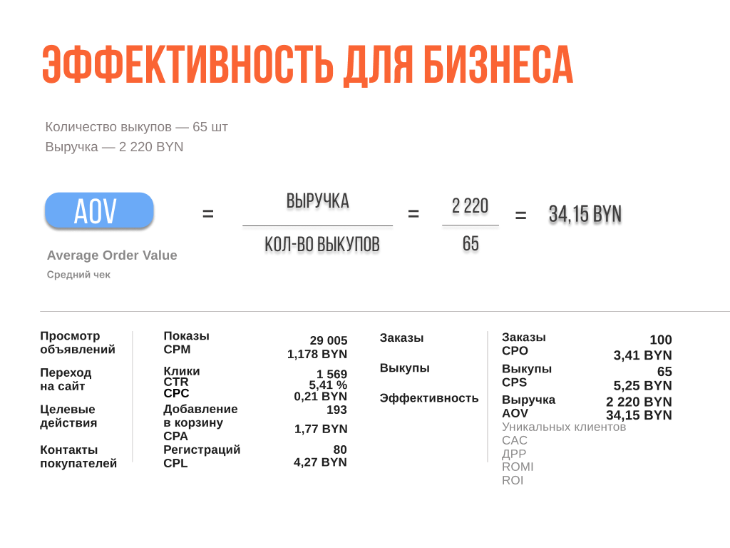 Средний чек AOV = 3250 / 65 = 50 руб