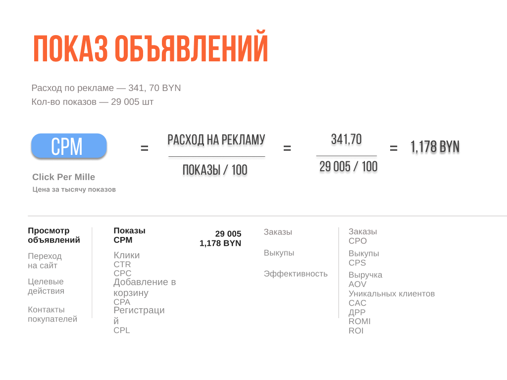 шаг 1. Считаем показатель CPM = 341.70 / 29 005 * 1000 = 1.18 руб (чтобы понимать сколько стоит показ рекламы на 1000 человек)