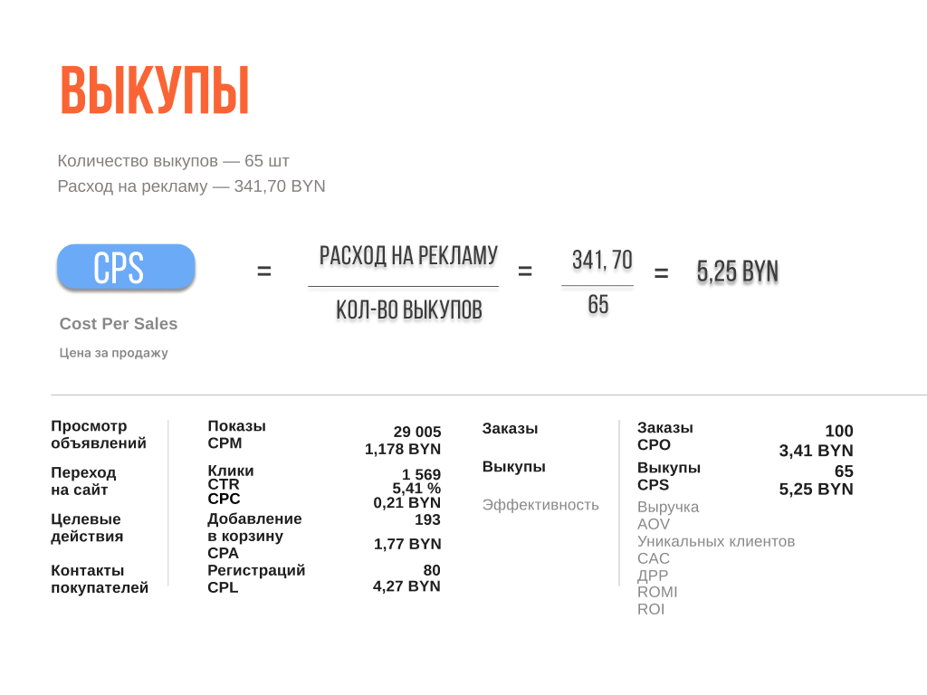 Шаг 8 Считаем Выкуп/оплата заказа— реальная продажа (CPS), поскольку не всегдв заказ является оплатой. Бывают возвраты, брак, не забрали товар.