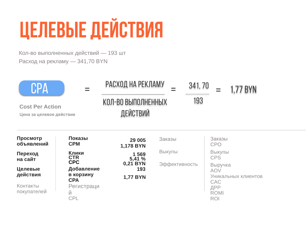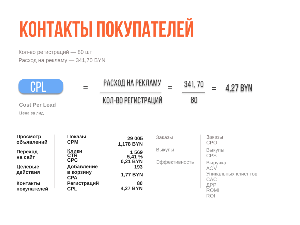 CPL = 341.70 / 80 (регистраций/контактов) = 4.27 руб