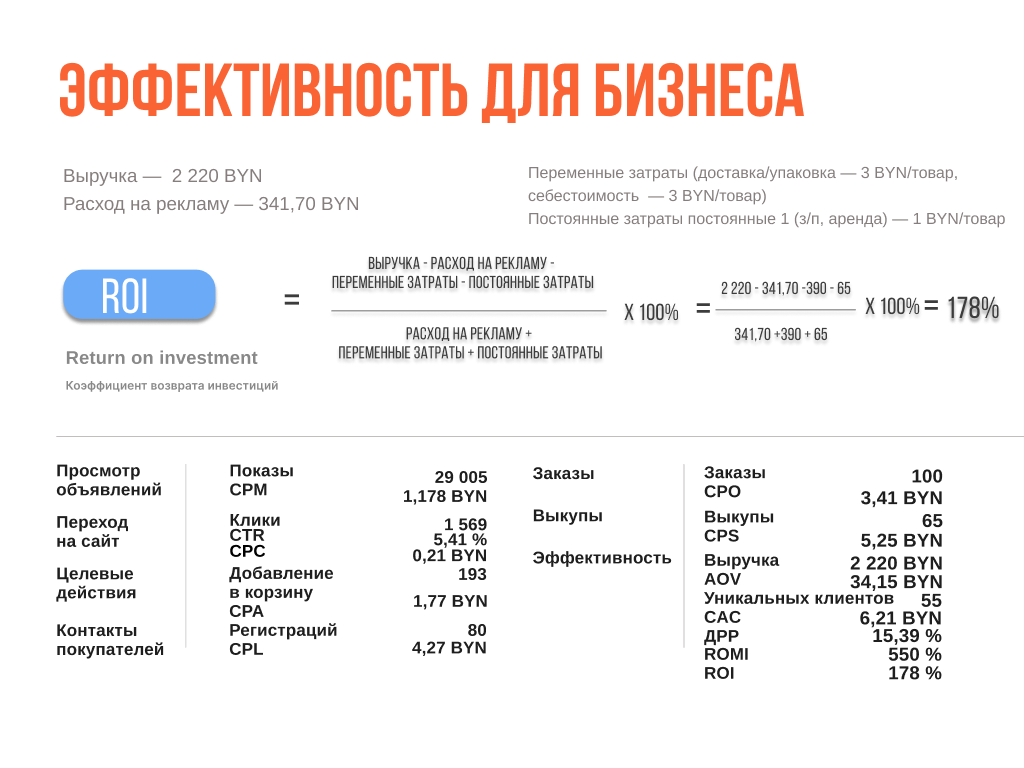 ROI (Return On Investment) — учитывает все расходы, включая постоянные и переменные. Этот показатель показывает, остался ли бизнес в прибыли или понес убыток.