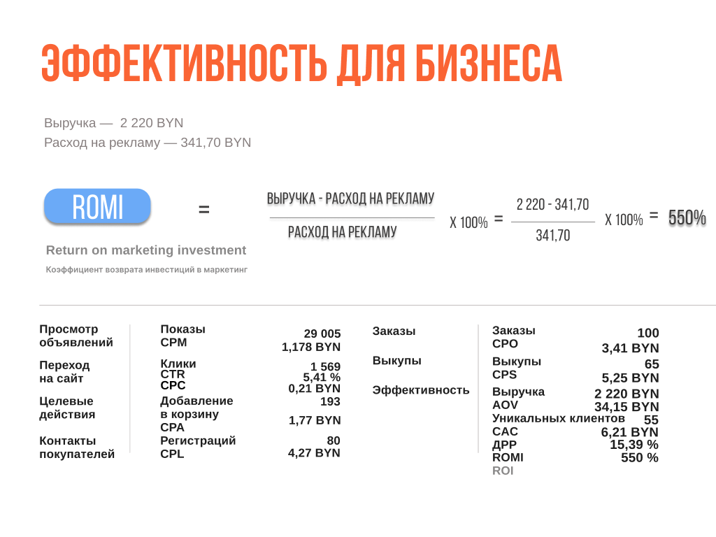 ROMI (Return On Marketing Investment) — показывает рентабельность вложений именно в рекламу. Здесь учитываем только рекламные расходы.