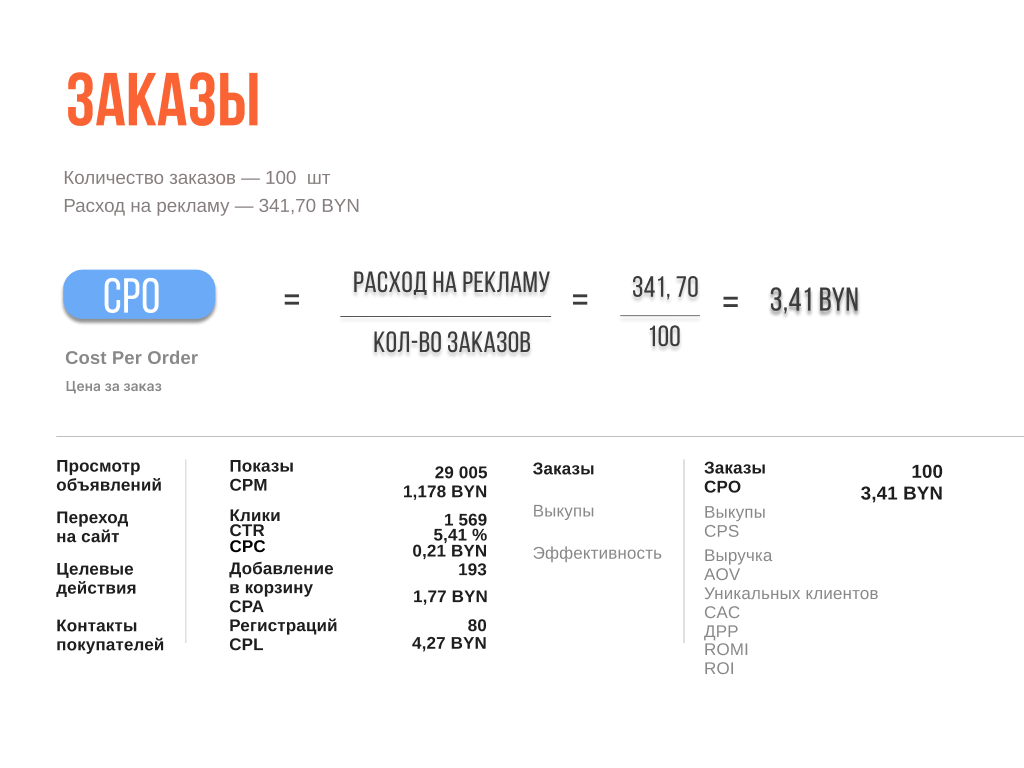 шаг 4 Считаем оформление заказы CPO = 341.70 / 100 = 3.41 руб