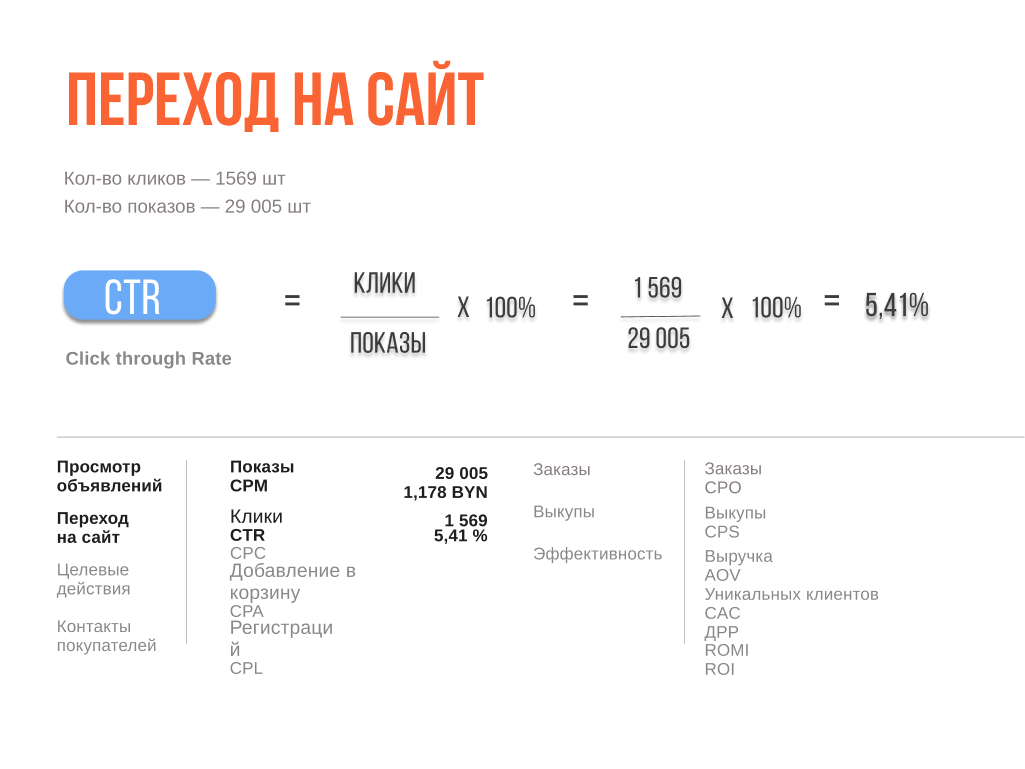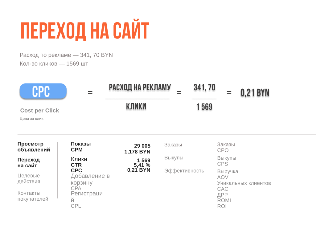 шаг 2. Считаем показатель CTR = 1569 / 29 005 * 100% = 5.41%, важно понимать насколько вы рекламой попали в боль и потребность аудитории рекламным объявлением и CPC = 341.70 / 1569 = 0.21 руб ( сколько нам стоит переход на. сайт или карточку товара на WB/ OZON)