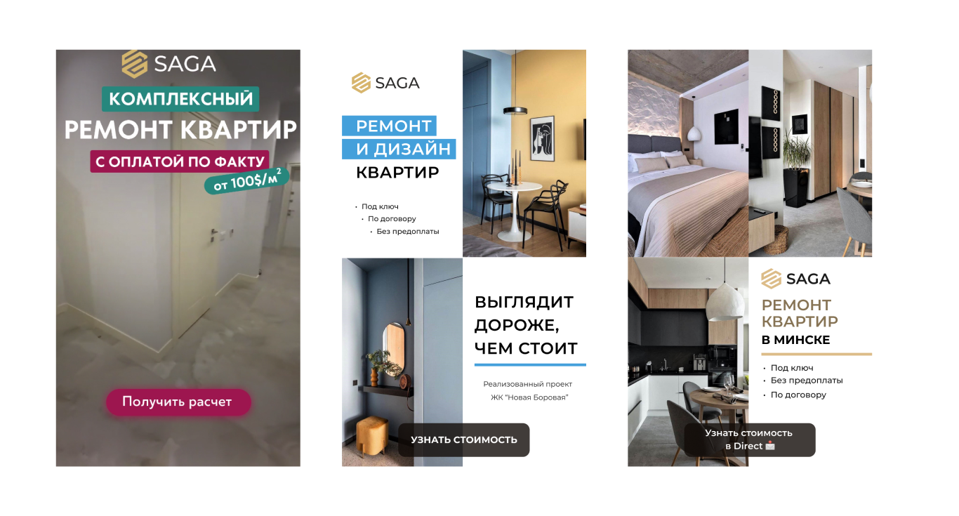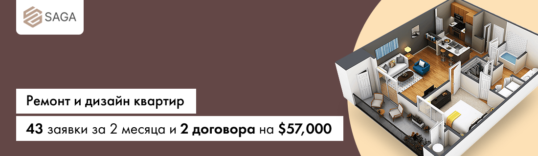 К нам обратился клиент из понятной для нас ниши строительства и ремонта. У него была конкретная цель — сделать 30 квалифицированных лидов благодаря таргетированной рекламе в Instagram и контекстной в Google. Поясним, что под словом «квалификация» понимается соответствие лида параметрам, которые задал клиент. Он сразу сказал, что студия ремонта и дизайна Saga делает ремонты ТОЛЬКО во всем объеме квартиры или дома «под ключ». По этой причине их не интересуют клиенты с запросами «сделать санузел», «отреставрировать гостиную», «постелить пол» и т. д.