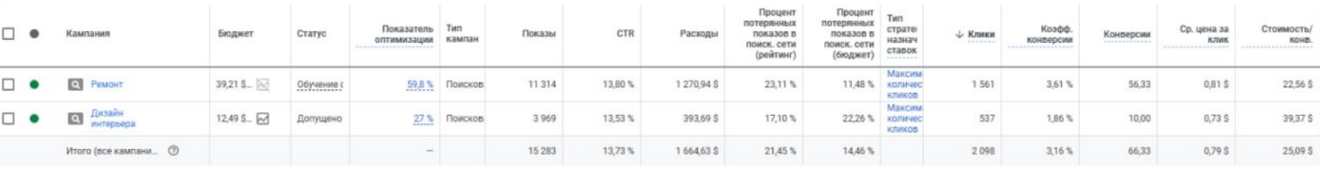 - ремонт — более 1,5 тыс. кликов по цене 2,61 byn и 56 конверсий по цене 72,5 byn.